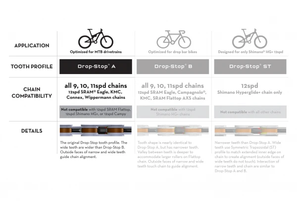- Disponible en deux profils de dents différents pour des performances optimales en fonction de votre type de chaîne. Utilisez Drop-Stop ST pour une utilisation avec les chaînes Shimano HyperGlide+ 12 vitesses. Utilisez Drop-Stop A pour toutes les chaînes 9, 10 et 11 vitesses ou les chaînes Sram Eagle, KMC, Connex ou Wippermann 12 vitesses.