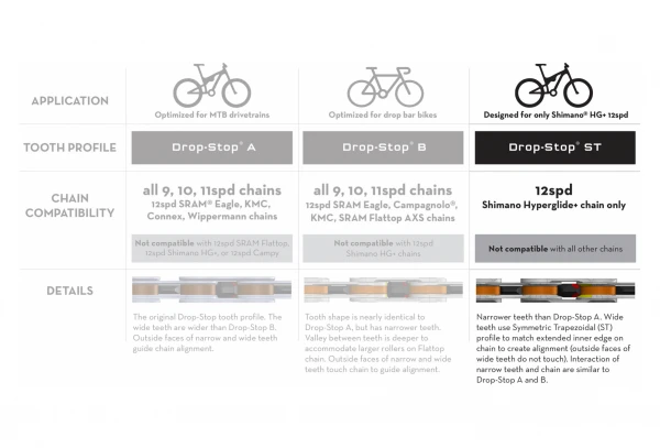 - Disponible en deux profils de dents différents pour des performances optimales en fonction de votre type de chaîne. Utilisez Drop-Stop ST pour une utilisation avec les chaînes Shimano HyperGlide+ 12 vitesses. Utilisez Drop-Stop A pour toutes les chaînes 9, 10 et 11 vitesses ou les chaînes Sram Eagle, KMC, Connex ou Wippermann 12 vitesses.