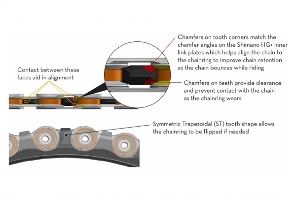 - Compatible uniquement avec la chaîne Shimano HyperGlide+ 12 vitesses. La forme trapézoïdale symétrique (Symmetric Trapezoidal ou ST) des dents est optimisée pour la chaîne Shimano HG+.